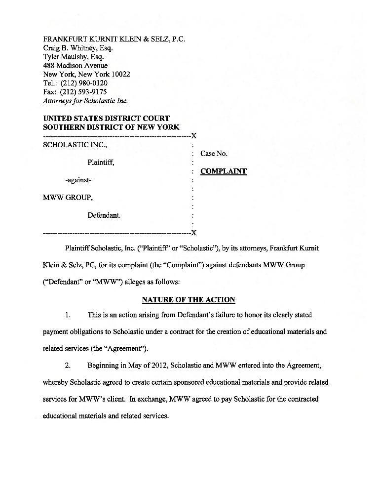 Mww Pr Lawsuit Mww Public Relations Group Sued By Scholastic